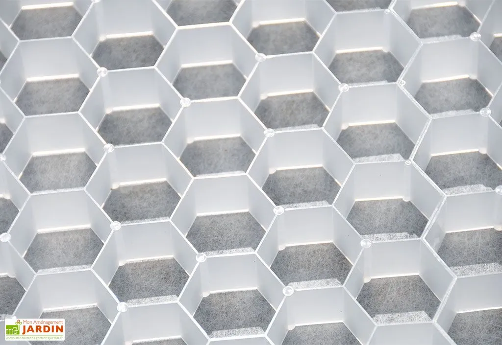 Les Bera Gravel Fix Smart se posent sans fixation et sont faciles à découper pour les adapter aux bordures. Résistants à 95 T/m² à vide et 300 T/m² avec gravier, ils permettent également une infiltration rapide (180 litres par seconde et par m²) et un drainage efficace des eaux grâce au géotextile d’une épaisseur de 68 gr/m² fixé sur sa base. Pour remplir les alvéoles des panneaux, il est conseillé d’utiliser du gravier de 3 à 15 mm.