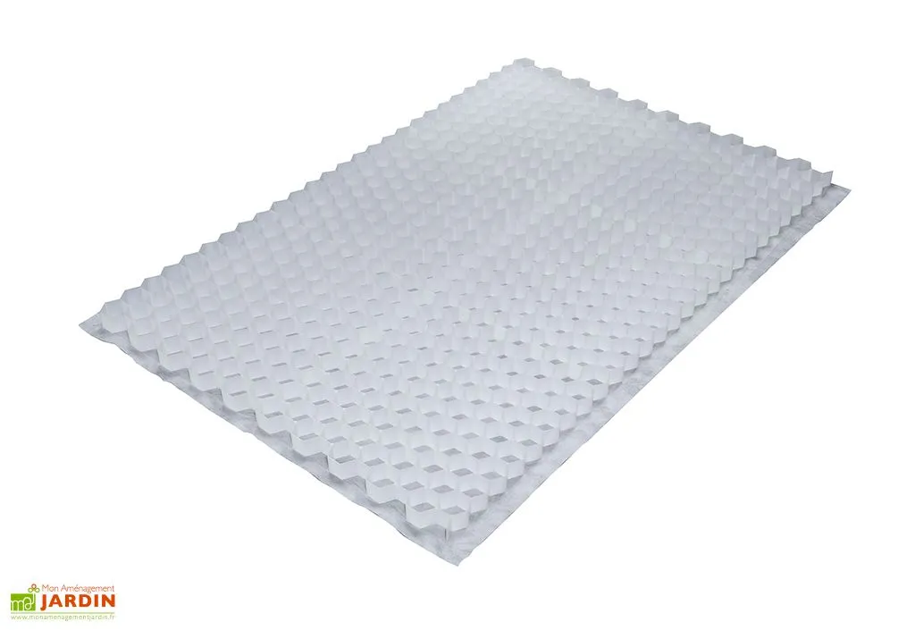 Chaque panneau mesure 117,6 x 76,4 cm pour une épaisseur de 32 mm avec des cellules de 42 mm. Il peut contenir 50 litres (soit 75 kg) par m² de gravier.
