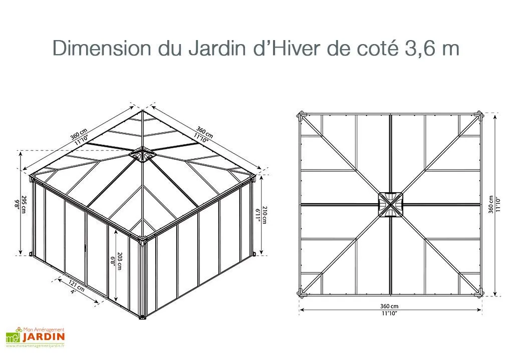 La pergola fermée mesure 3,60 m de longueur et de largeur et 2,95 m de hauteur. Elle offre ainsi une surface de 13 m².
