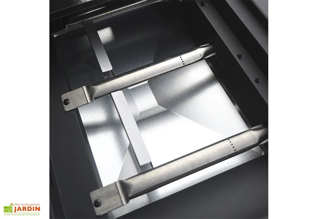 Très puissant, le barbecue au gaz dispose de trois brûleurs en acier inoxydable offrant une puissance de chauffe optimale et permettant une cuisson rapide ainsi qu’uniforme. Il intègre des boutons avec indicateurs de chaleur pour une cuisson parfaite et précise. L’allumage du barbecue se fait facilement grâce au système de piezo intégré dans chaque bouton. Le capot est doté d’un thermomètre pour contrôler la température.