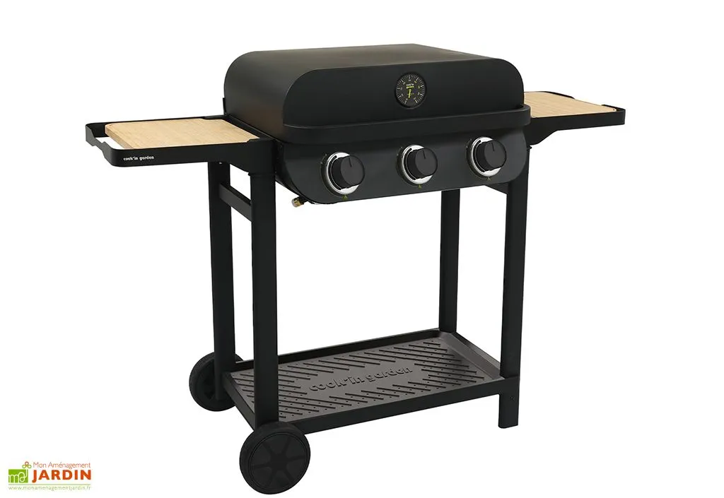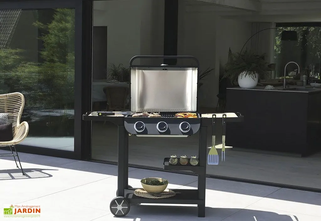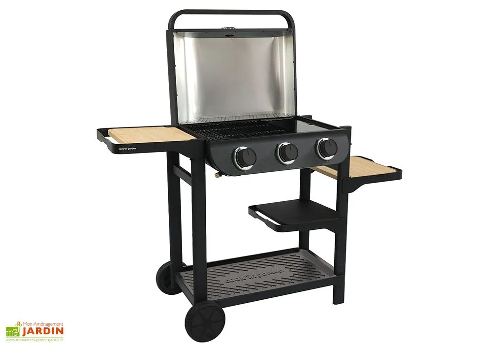 Le barbecue est doté d’une structure robuste en métal composée de deux grilles et d’une plancha en fonte émaillée. Cette structure repose sur un chariot doté de deux roues vous permettant de déplacer facilement votre barbecue au gaz. Ce dernier intègre trois tablettes, dont deux avec des planches à découper vous offrant une grande surface de travail pour préparer vos aliments en toute efficacité et pour stocker vos ustensiles.