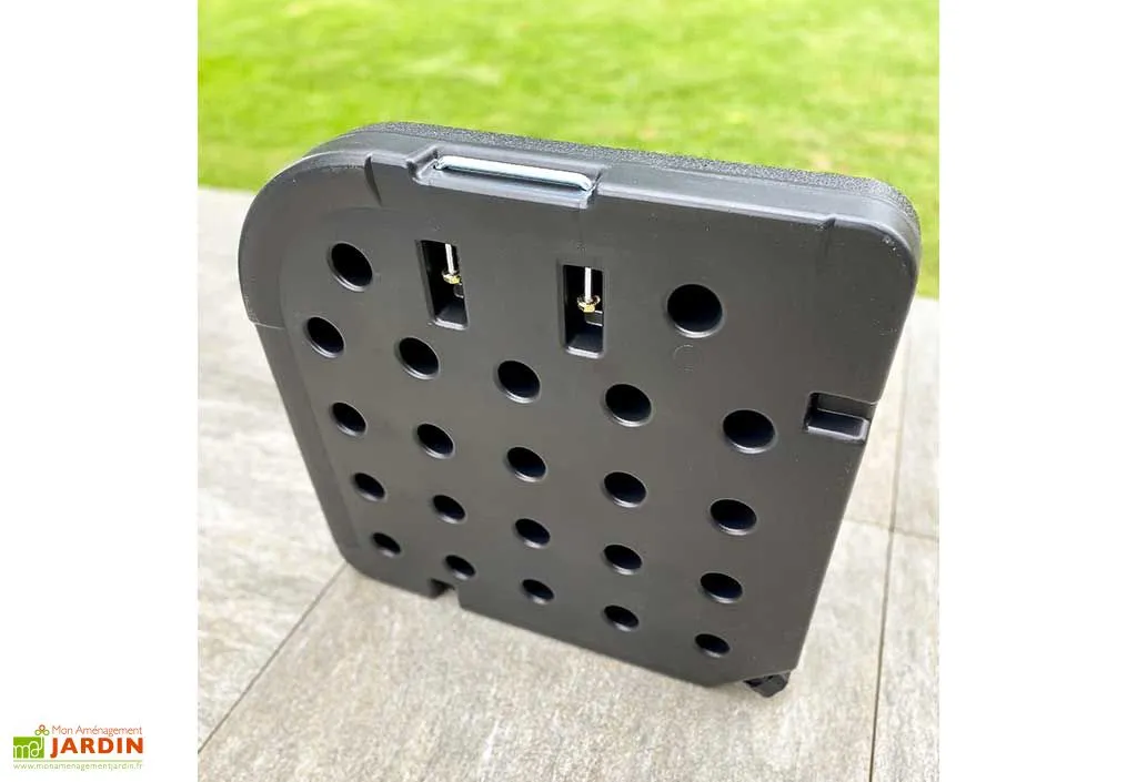 Ce lot de quatre dalles en plastique DCB Garden vous permettra de stabiliser votre parasol afin d’éviter tout risque de basculement. Chacune d’entre elles mesure 50 cm de côté pour 7,5 cm de haut et pourra être lestée à l’aide de sable ou d’eau (volume par dalle : 15 L). Notez qu’à vide, ces dalles pour parasol ne pèsent que 1,9 kg et qu’elles pourront de plus être aisément transportées grâce à leur poignée.