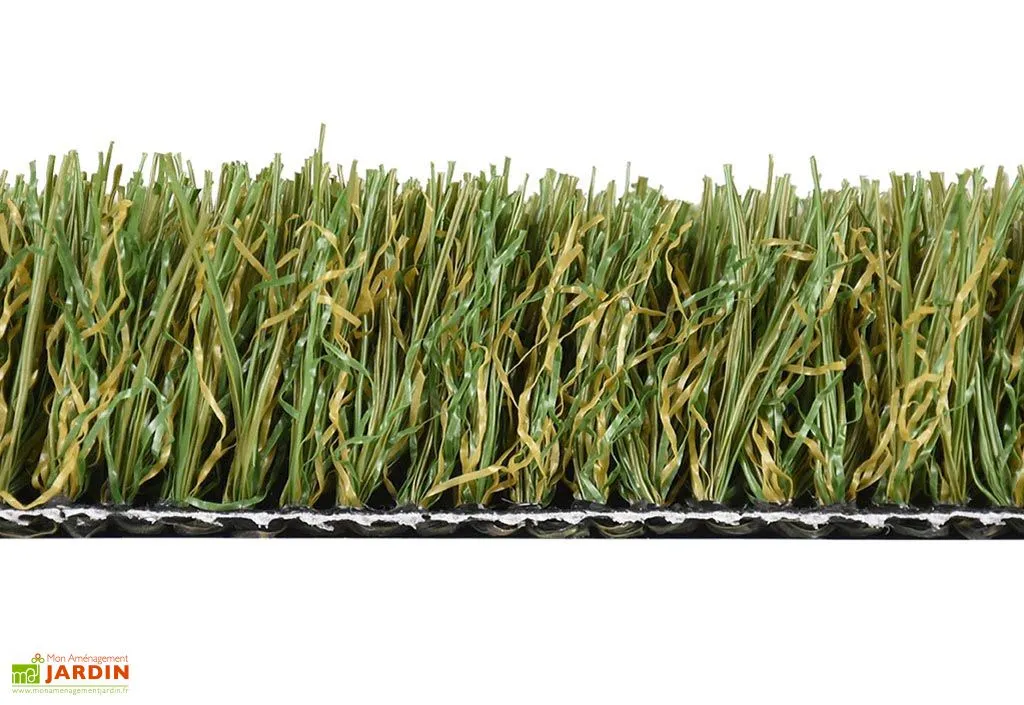 La pelouse artificielle fabriquée en polyéthylène et polypropylène est extrêmement réaliste. En effet, un soin tout particulier a été apporté à l’esthétisme : brins fournis, 4 nuances de vert / brun, fibres et tailles de formes variées… Et la qualité n’est pas en reste puisque les fibres sont douces au toucher, elles se relèvent quand on marche dessus et elles sont résistantes à l’arrachement.