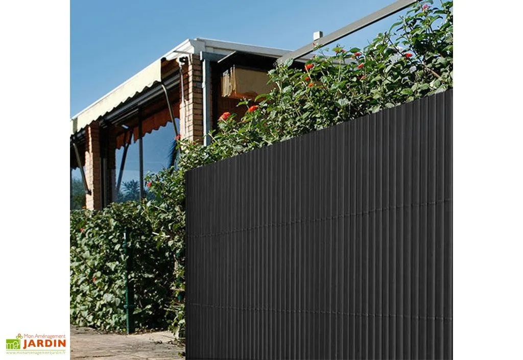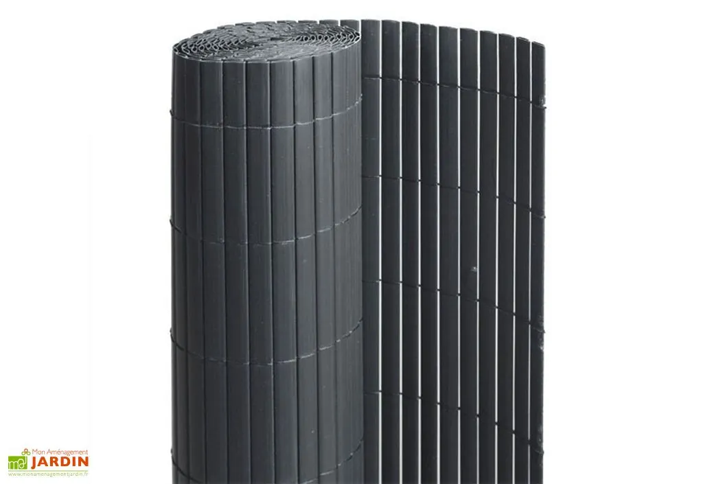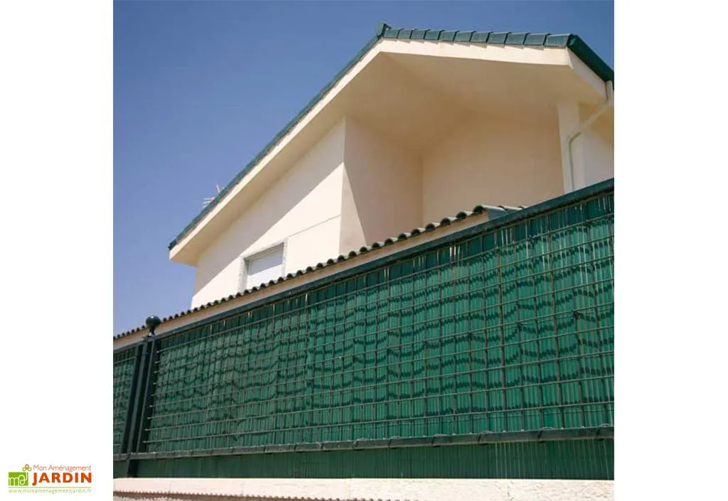 Cette canisse de chez France Green mesure 1,20 x 3 m (hauteur, longueur) et pèse 1,6 kg/m². Elle est à double face et comporte des lattes tubulaires en PVC de 16 mm de large sur environ 3,5 mm d’épaisseur. L’espacement des coutures est environ de 10 cm et les lattes sont espacées d’environ 0,45 cm.