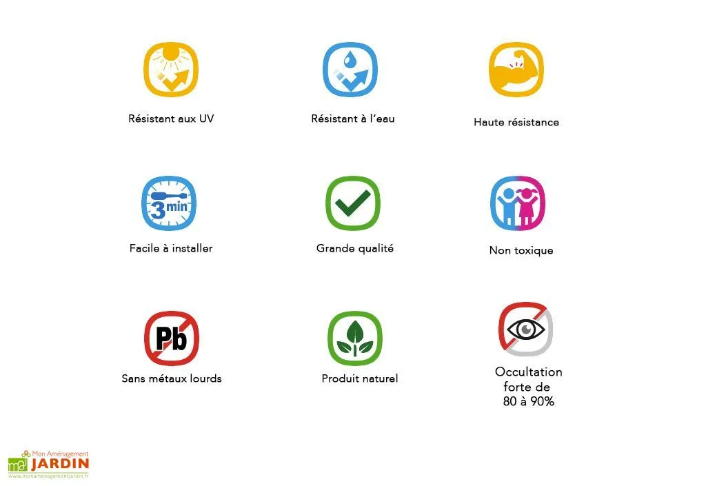 La clôture de chez France Green mesure 1 m de hauteur et 5 m de largeur. Elle est en écorces de pin, 100% naturel. La clôture dispose de lattes tissées tous les 10 cm avec du fil galvanisé pour une résistance optimale. Le brise-vue dispose d’une occultation forte de 80 à 90%. Il est résistant à l’eau et aux UV et ne demande aucun entretien. Vous pouvez l’installer en seulement 3 minutes sur une barrière, un grillage ou une grille pour vous cacher des regards extérieurs et pour embellir votre jardin, votre terrasse ou votre balcon. La canisse 100% naturelle est non toxique pour l’environnement ni pour la santé puisqu’il est fabriqué sans métaux lourds. Elle est recyclable. La garantie est de 2 ans.