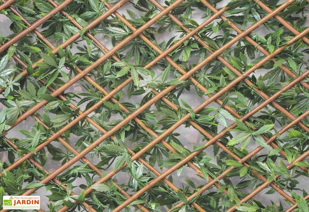 Le feuillage artificiel compte environ 540 feuilles au m². Le feuillage est en polyéthylène et le treillis sur lequel il repose est en bois de saule rigide. Il possède ainsi une épaisseur de 35 mm environ. Le feuillage est présent sur une face du panneau.