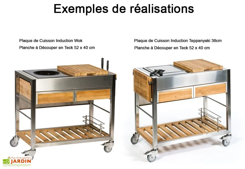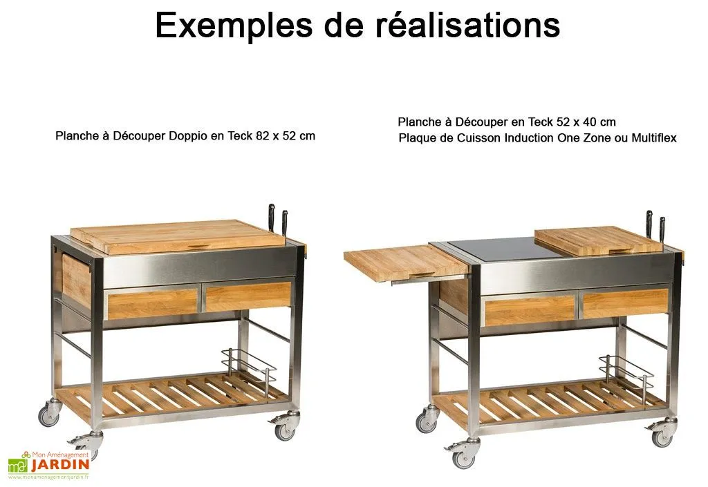 Les plaques de cuisson ne sont pas incluses, elles sont disponibles dans la rubrique « Accessoires » et doivent être commandées en même temps que le chariot pour se transformer en cuisine d’extérieur. Si vous ne souhaitez pas installer de plaques de cuisson, vous pouvez choisir d’installer une grande planche à découper Doppio en Teck 82 x 52 cm.