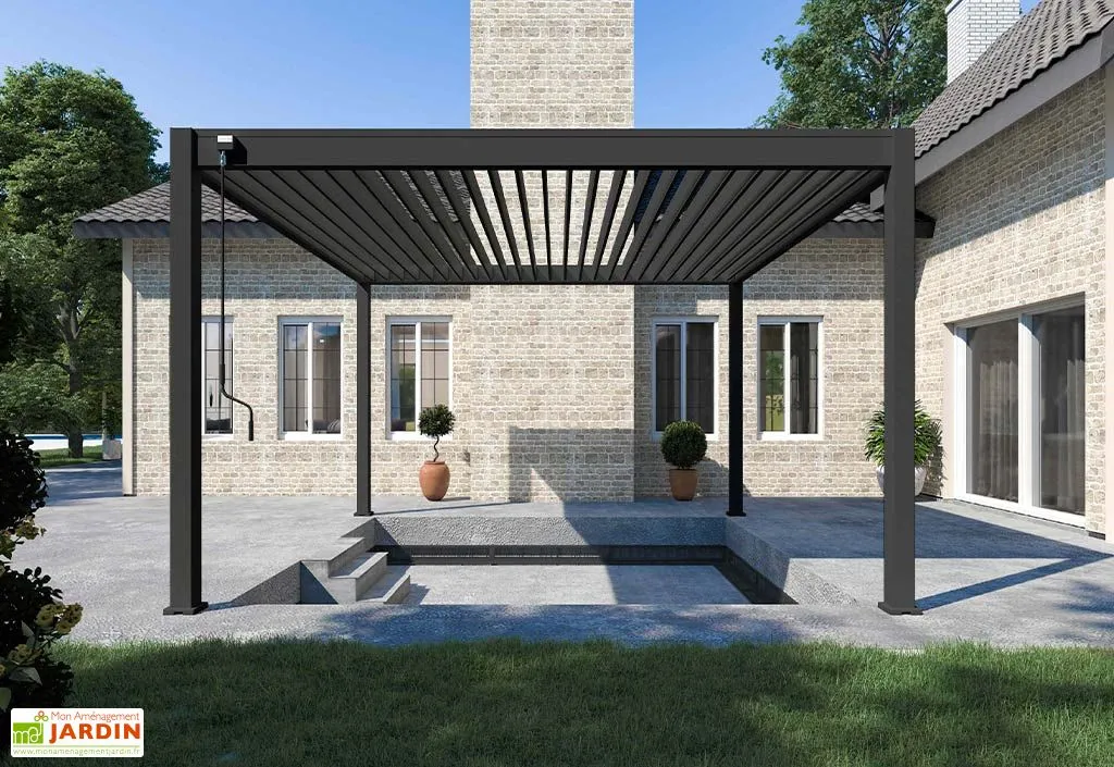 Cette pergola bioclimatique signée Ombréa possède une surface de près de 16 m² grâce à des dimensions de 3,99 x 3,99 m de côté pour 2,56 m de hauteur. Ses dimensions et sa hauteur de passage de 2,36 m permettent de circuler facilement sous sa structure et d’y installer un salon de jardin ou un spa par exemple.