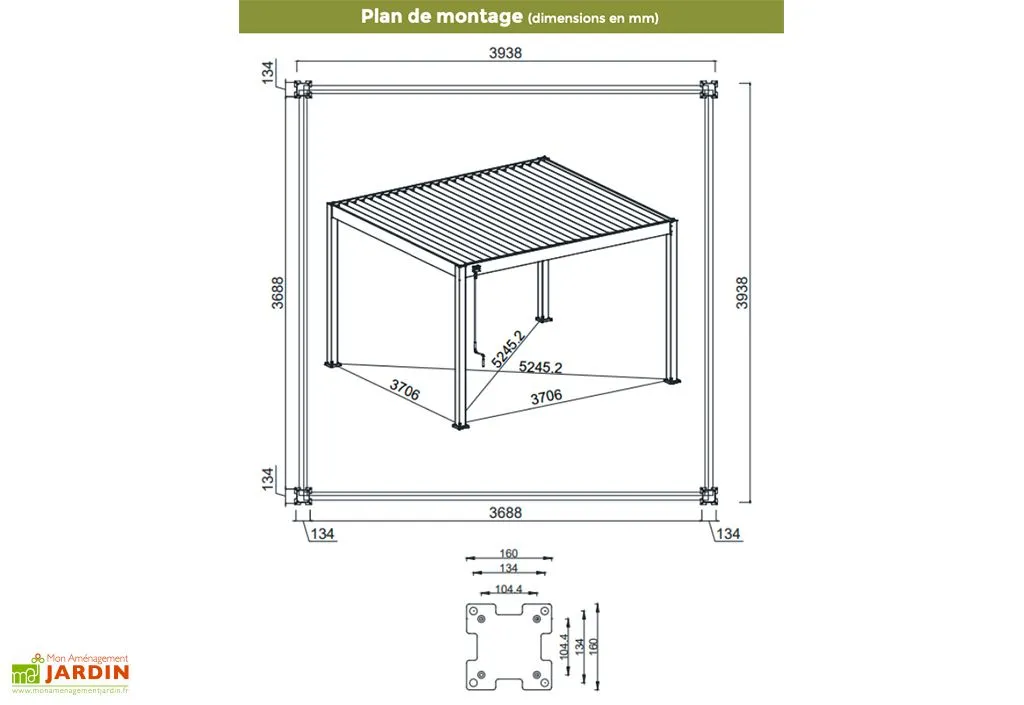 Cette tonnelle en aluminium est livrée en kit. Sa visserie en inox, en acier galvanisé et en nylon est incluse. Un kit de fixation est également prévu avec la structure. Il comprend 4 platines de fixation de 16 x 16 cm et 16 chevilles pour béton. Il est conseillé de la fixer sur une dalle de béton ou sur des plots en béton de 25 x 25 cm.