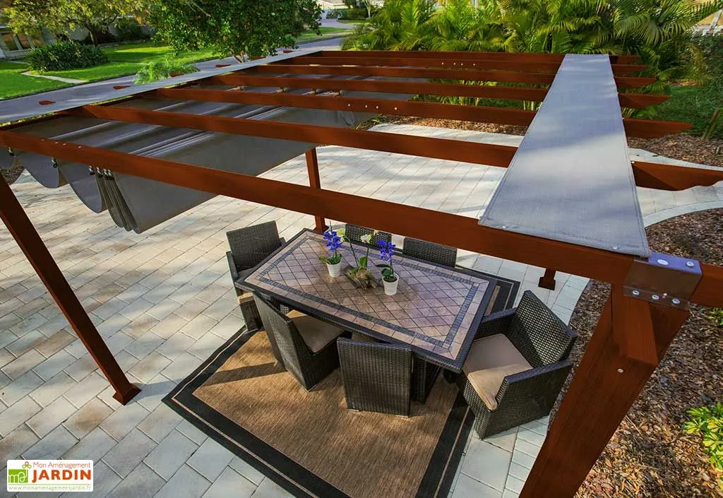 Cette pergola autoportante mobilise une solide structure en alu notamment composée de poteaux carrés de 11 cm de côté. L’aluminium étant un matériau robuste et naturellement insensible à la rouille, aucun traitement préalable du métal n’est alors nécessaire. La pergola résistera en effet aux intempéries et autres agressions extérieures sans toutefois exiger d’entretien particulier. Le tout pourra alors passer l’hiver dehors sans être démonté (hormis le voile d’ombrage).