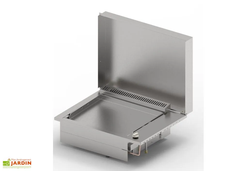 La plancha gaz à encastrer de PlaNet est en inox 304 de qualité alimentaire. Elle mesure 73 cm de longueur, 56 cm de largeur et 20 cm de hauteur et demande une découpe de 70 x 53 x 38 cm (l,l,h) pour être installée.