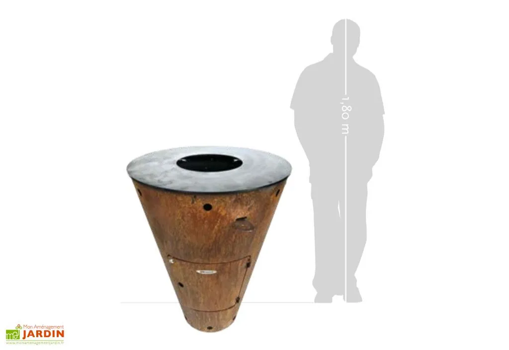 Le braséro César de Remundi en forme de cône est original. Fabriqué de façon artisanale, il bénéficie d’une double utilisation ; c’est à la fois un chauffage extérieur et un barbecue / plancha. Il mesure 72 cm de diamètre et 85 cm de hauteur, ce qui en fait un grand braséro de jardin.