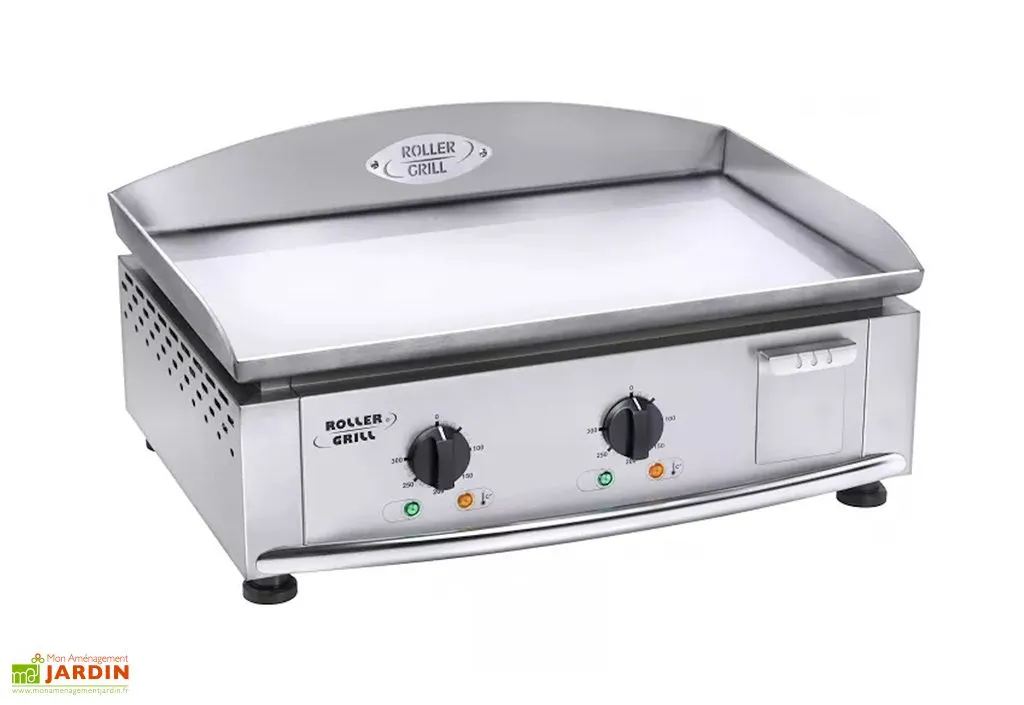 Cette plancha électrique de la marque Roller Grill vous permettra de préparer de délicieuses grillades pour 6 à 10 personnes. Elle possède une puissance de 3500 W (230 V) et dispose de deux zones de cuisson indépendantes sur lesquelles vous pourrez griller différents types d’aliments. Chaque zone est équipée d’un thermostat 0 – 300°C et d’une résistance en serpentin en acier inoxydable Incoloy.