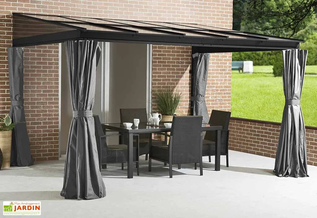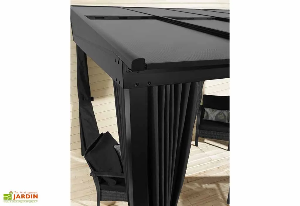 Solide et très stable, ce toit terrasse mobilise une structure en aluminium notamment composée de poteaux de 7,6 cm d’épaisseur. Robuste et naturellement insensible à la corrosion, l’aluminium est un matériau idéal pour l’extérieur et qui, à l’image de l’ensemble de la tonnelle, ne vous demandera aucun entretien particulier. A noter également, la présence de moustiquaires en nylon et de rideaux en polyester dont la couleur grise s’accordera avec la finition anthracite de la tonnelle.